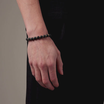 Dieses Armband aus schwarzen Onyx-Perlen und 18-karätigen Goldakzenten bringt Ausgewogenheit und Tiefe in Ihre tägliche Rotation. Die glatten Perlen sorgen für einen sauberen und dezenten Look, während die Golddetails Wärme und Charakter verleihen, ohne Ihren Stil zu dominieren. Auf einem flexiblen Stretch-Fit-Kern aufgefädelt, sitzt es bequem am Handgelenk, egal ob einzeln getragen oder mit Ihren Lieblingsstücken kombiniert.