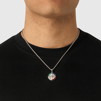 This handcrafted pendant features a sterling silver compass, framed by a ring of precision-set crystals and vibrant enamel detailing. For centuries, the compass has symbolised guidance, exploration, and the courage to move toward the unknown. The contrasting enamel segments reflect the different paths that shape a man’s journey. The lessons, the risks, and the detours that define it. At its centre, the compass rose stands as a reminder that no matter where you go, your course is yours to choose.