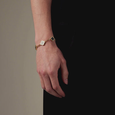 This bracelet features a series of our iconic 4-leaf clover motifs, each framed in 18K gold and set with a deep black inlay. Designed to replicate the depth and richness of natural onyx, its surface is sealed with a durable, scratch and fade-resistant finish. Beveled oval links ensure a comfortable fit on the wrist, while our snap-proof clasp ensures this piece is truly CRAFTD to last.
