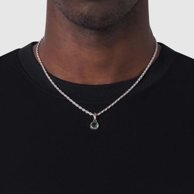 This sterling silver pendant is finished with molten detailing and set with a precision-cut emerald stone. Cast exclusively from precious metals, it carries a weight and presence you feel the moment it rests against your chest. The details are smooth, the polish runs deep, and it reflects the light in a way only real silver can. Pair it with any matching sterling silver chain, or wear it on your existing chains up to 2mm in width.